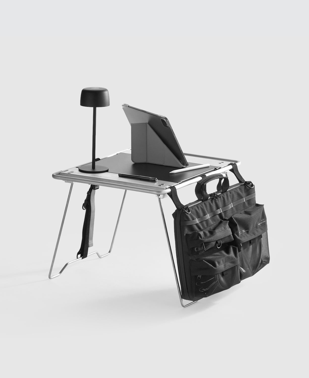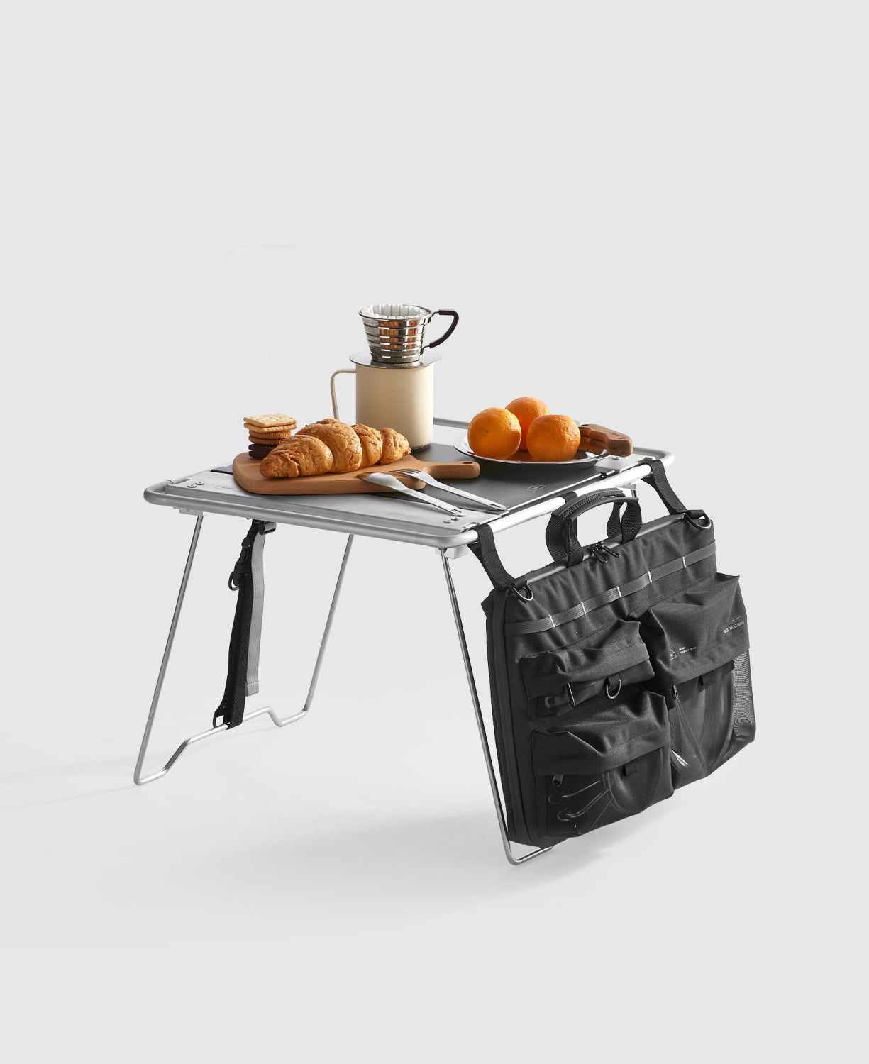 When attached to the Nomad Table, the bag transforms into a vertical storage workstation, freeing tabletop space. Breathable mesh pockets allow wet utensils and cooking tools to dry quickly. The padded interior and multi-compartment layout are perfect not only for table plates and kitchenware but also for laptops, cables, and tech accessories.